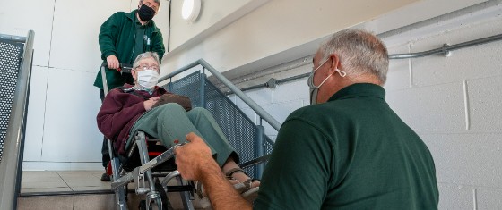 For each booking, two drivers are involved in supporting the passenger from their home and onto the vehicle. One driver goes in front of the passenger and the other is behind the passenger who guides and operates the stair climber. The passenger moves from their wheelchair to the stair climber, and then the drivers will push the passenger to the stairs and start the stair climber to glide down the stairs. Once at the bottom of the stairs, the passenger will move back to their wheelchair and the driver will take them to the Dial-A-Ride vehicle, ensure they are safely onboard and take them to their chosen destination.